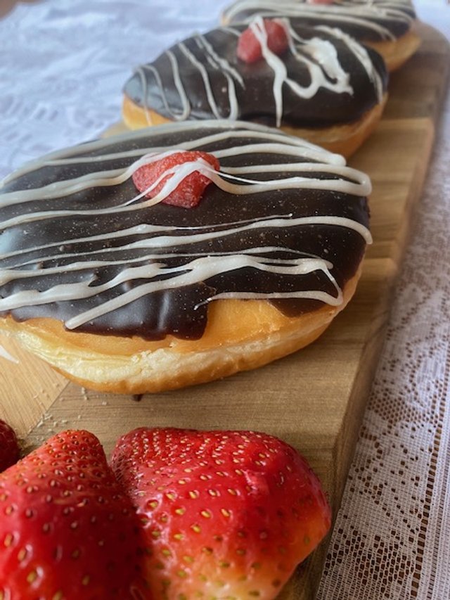 Sweet donuts made with love are perfect for February's feature donut. These fluffy donuts are stuffed with strawberry filling, then topped with chocolate and finished with drizzled white fondant and a berry. Pondering what to get for your Valentine sweetie...look no more in the month of l'amour, grab some Chocolate Strawberry donuts.