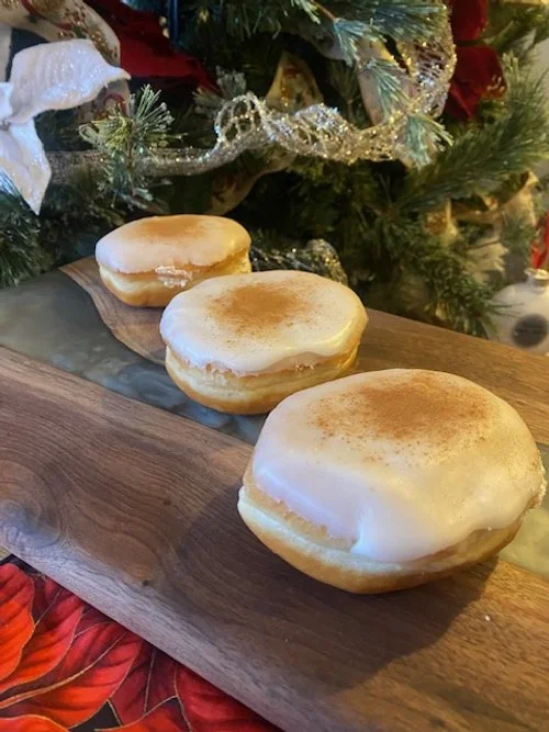 What’s the holiday season without a little eggnog? Our Eggnog yeast donut is back! This rich, festive donut is filled with creamy eggnog filling (rum flavouring, eggnog syrup and whipped topping), bursting with hints of nutmeg and cinnamon and topped with vanilla fondant.